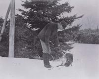 Partially faded black-and-white image of Blake Constable, in his early twenties, posing with a pair of skis. Trees are
