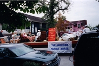 Image of two vendors lining the side of the road during a parade in downtown Cookstown. On the left is a table for