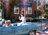 South Simcoe Queen of the Furrow, Melanie Quist, on a tractor during a parade on Queen Street in Cookstown, 1997.