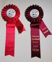 Photo of two ribbons featuring the Cookstown Agricultural Society's coat of arms, which would have been awarded by