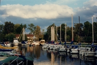Colour photograph showing a number of boats docked at a harbour in Innisfil. The image was originally identified as