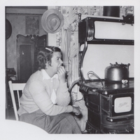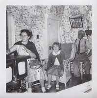 Photo taken of Velma Gibbons [left], Marion Gibbons [centre], and Orville Terry [right] inside a home. All three are