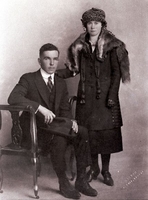 Wedding photo of William Samuel Young and Cora Kathleen Guest taken on 26 October 1921. William is seated on a bench
