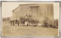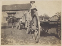 Sepia-toned photo of members of the Young family with a horse drawn wagon in a farmyard. Pictured from back of the wagon