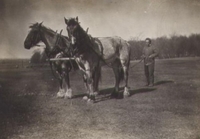 William "Bill" Young posing with his two large roan-coloured draft horses, Prince and Dick.
