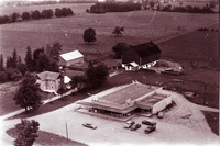 Aerial photo of the Stroud Plaza taken in the 1960s. The photo shows Young's grocery store in the centre with a farmouse