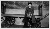 Photo of George Young labeled River Manitoba, April 1945. He is seated on an empty wagon, dressed in an RCAF uniform