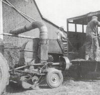 Photo of Roy Goodfellow and Calvin Boyd in 1954 working with a McKee Harvester to fill an open silo with corn silage. A, IHS3934