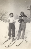 Photo of Mary Young and Keith Campbell skiing out to Keith's plane, which had been grounded during a snowstorm on the