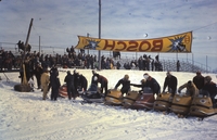 Colour photo of the starting line of a snowmobile race that took place at Sunset Speedy taken sometime in the early