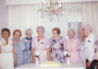 Colour photo of a group of members of the Painswick Women's Institute gathered behind a dining table with a slab cake on