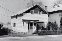 Black-and-white photograph of a two-storey detached home with horizontal siding and a steep gabled roof. The front