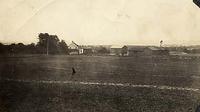 Black and white photograph of a wide agricultural field with a single person in the foreground. In the distance are