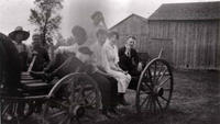 Photo of a wagon ride taken on the Latimer farm. Pictured second from the right is Lena Latimer, and standing behind her, IHS2387