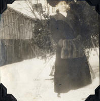 Airplane Motor driven Snow Sled made by Mr. Harold Shepard. Mr. Percy Pearson from Toronto, in front of machine, IHS692