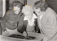 Preparing the wedding cake for serving at the open house - Alice Baker, Peggi Brown and Daureen Brown - June 1979.,