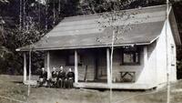 Photo of the McCullough family in front of their home. Pictured are Edith McCullough sitting on steps, and her parents, IHS1979