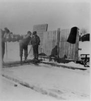 Ice house where they took ice in, in Bell Ewart. Byron Grose and Fred Quantz on bridge made of planks. They are, IHS655