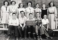 Class photo taken in 1949 of the grade 8 students of Cookstown Public School. The seven girls are standing in the back,