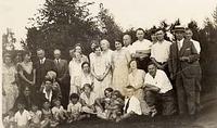 Photo of a large group of people of all ages on a Sunday School picnic in the summer in Cookstown. The women are wearing,