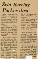 Scan of a newspaper article clipping about the passing of Zeta Barclay Parker on Wednesday 30 January [1974]. Services