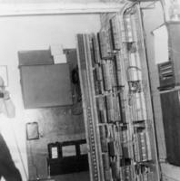 Photo from 1964 of the mechanism behind a telephone switchboard in the Ancient Order of United Workmen's Hall. The, IHS483