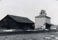 Photo of a grain elevator and coal shed located in Cookstown. The elevator, located on the right, is white and has a,