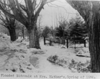 Photo showing a sidewalk curving between trees that is flooded. Most of the ground is still covered with chunks of snow, IHS3382-58C