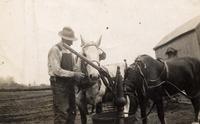 Doing roadwork to Tollendal. S. Blackmore and Fred Warnica driving horses. This is showing how roadwork was done then., IHS234