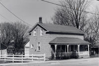 Photo taken from the southwest view of the Carr Homestead, a small house composed of dichromatic brick. The roof, yard,, IHS2287